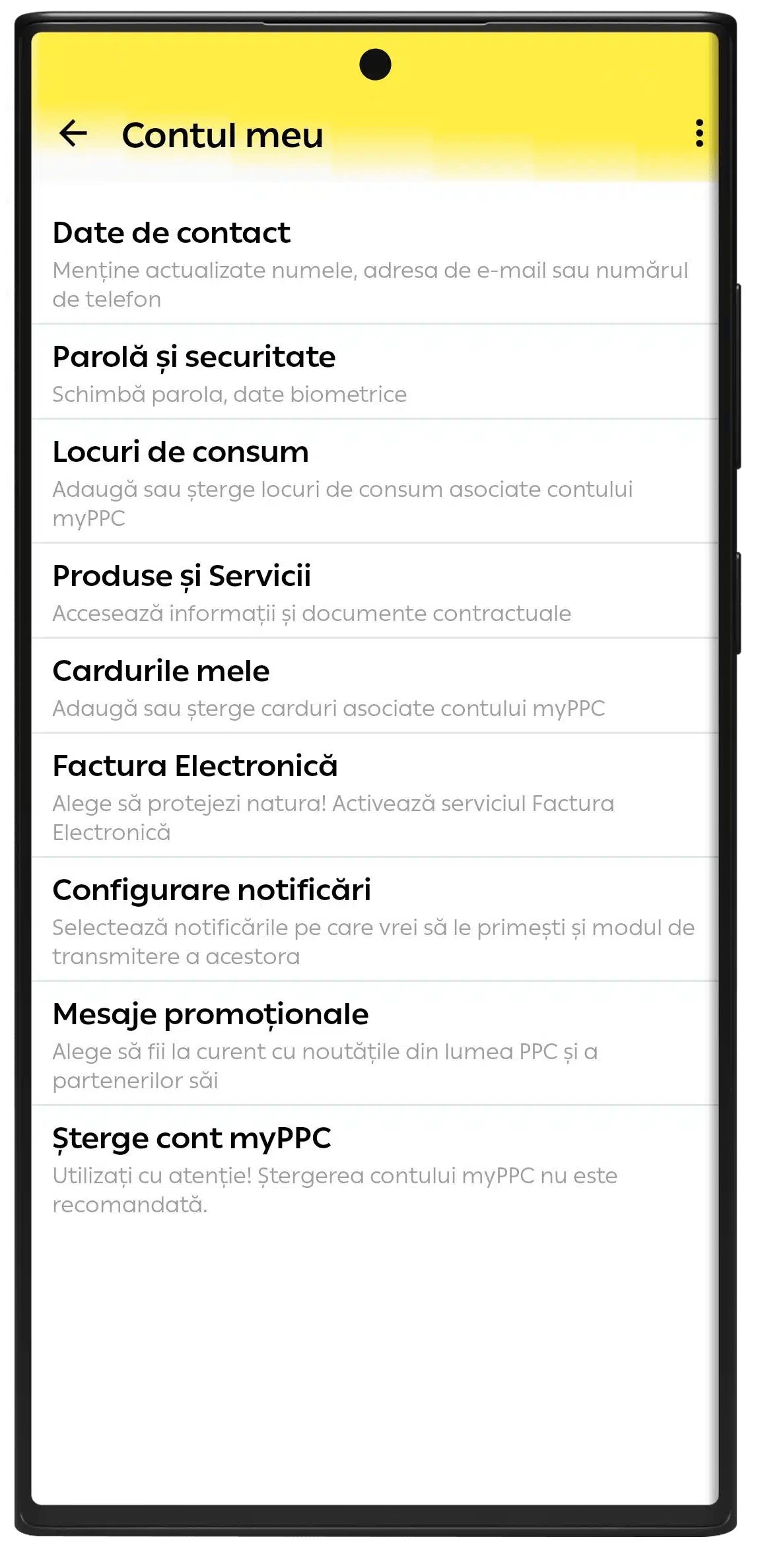 Bár a különleges adatok (Személyi azonosító szám – CNP – természetes személyek esetében, Egyedi regisztrációs kód – CUI – jogi személyek esetében, nemzetközi formátumú mobiltelefonszám és e-mail cím) olyan adatok, amelyek az energiaellátási szerződésen is szerepelnek, a myPPC alkalmazás felhasználójának regisztrációjához szükségesek. Ez lehet a szerződéstulajdonos, de lehet a háztartás egy másik tagja is, aki szeretne hozzáférni az alkalmazásban található lehetőségekhez, de nem a szerződéstulajdonos.